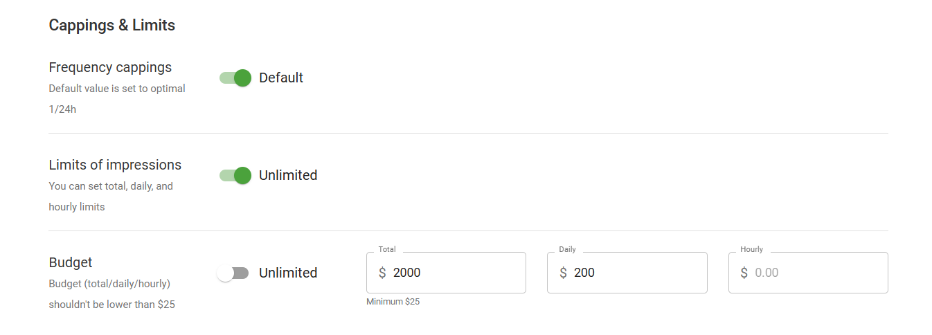 Finally, we set a total campaign budget of $2,000 and moved to the Cappings and Limits section to add a daily spending cap of $200.