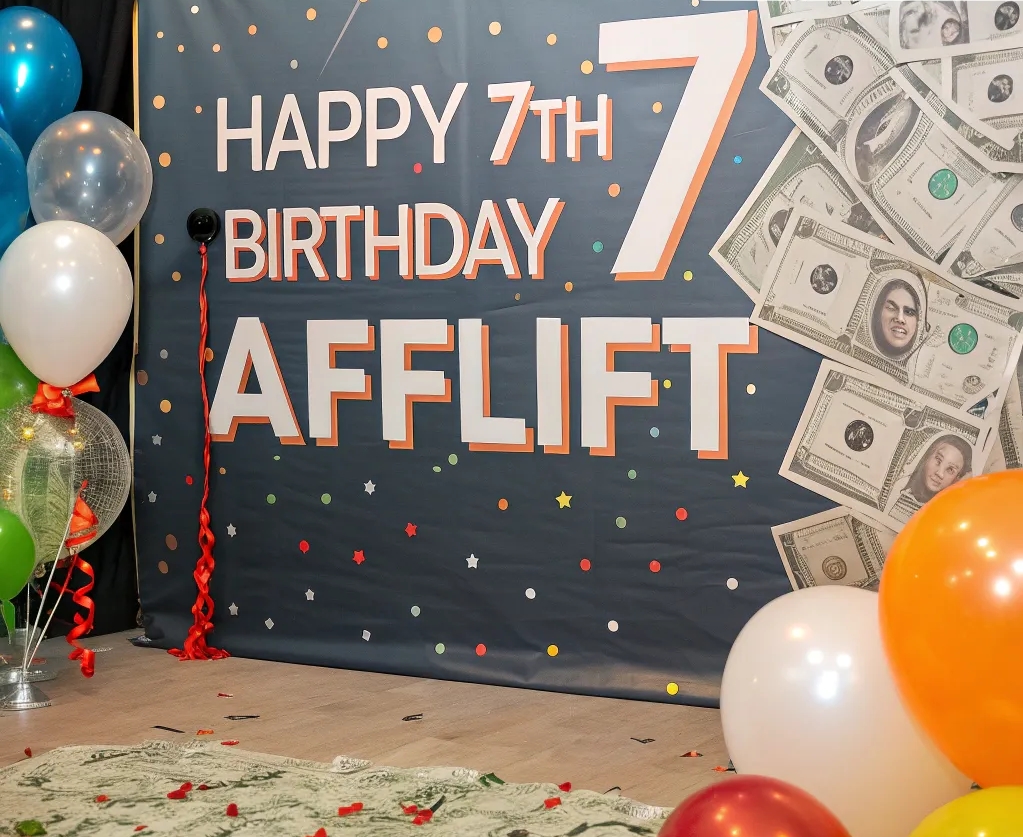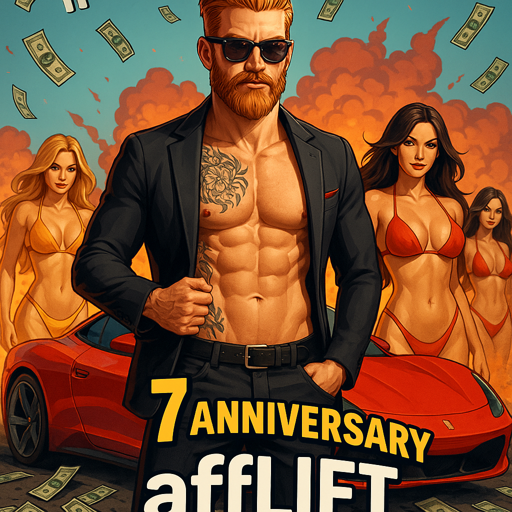 Funny 7th birthday card addressed to "Afflift", young man wearing suit with beard and glasses, bank notes flying around, piles of money on ground, ferrari, explosions, party, comic book style, bikini babes, huge breasts