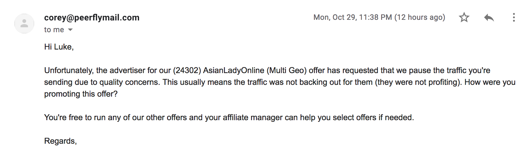 So, I was blacklisted on the AsianLadyOnline offer in the middle of the night. No big deal. It happens to everyone (even me). Apparently the traffic wasn't backing out as well as it needed to (the payout is pretty high).