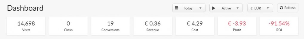 BeMob dashboard shows that with my $5 spent (they only tracked $4.59), I got 16 conversions and made $0.35.