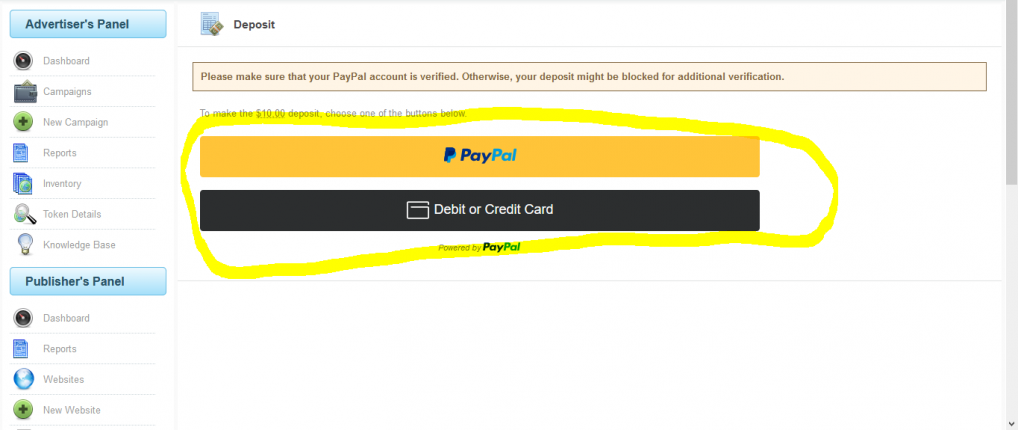 Once you register, you can go ahead and deposit the $10 we will use to run your first campaign. Under