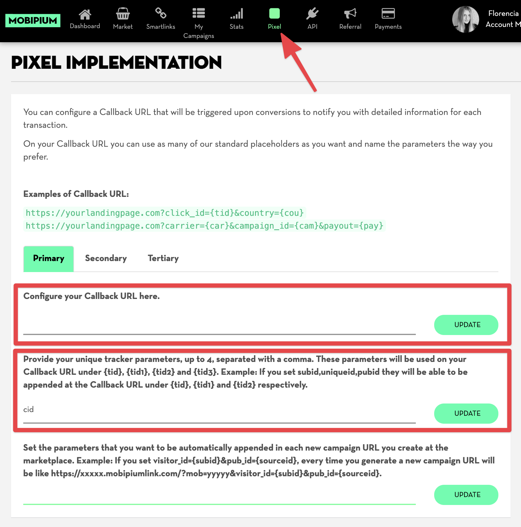 Click UPDATE next to the box you just added cid to and your MOBIPIUM account is now all setup to notify your BeMob whenever you get a conversion!