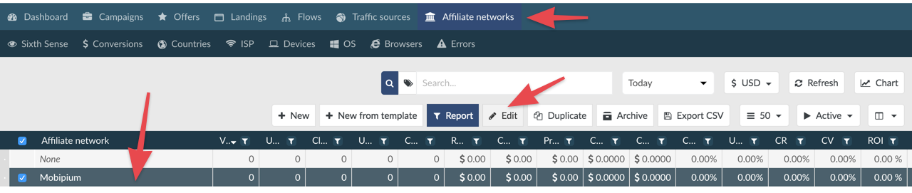 Go to Affiliate networks in BeMob and click on Mobipium and then the Edit button: