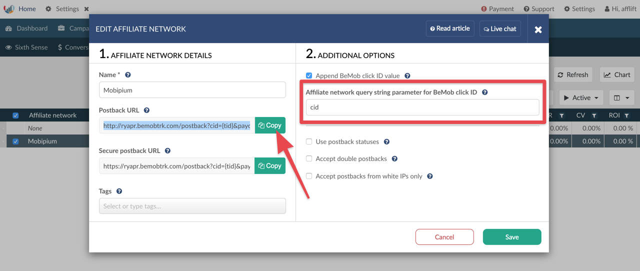 Hi, in my Bemob tracker, for "Additional Options" in step 2 of the edit affiliate network, the was no "cid", but "trk"
