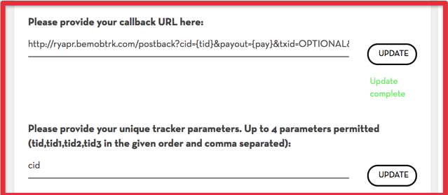 Go back to MOBIPIUM and paste your Postback URL into the Callback URL box. Click the UPDATE button next to the box to update your postback/callback URL in MOBIPIUM.