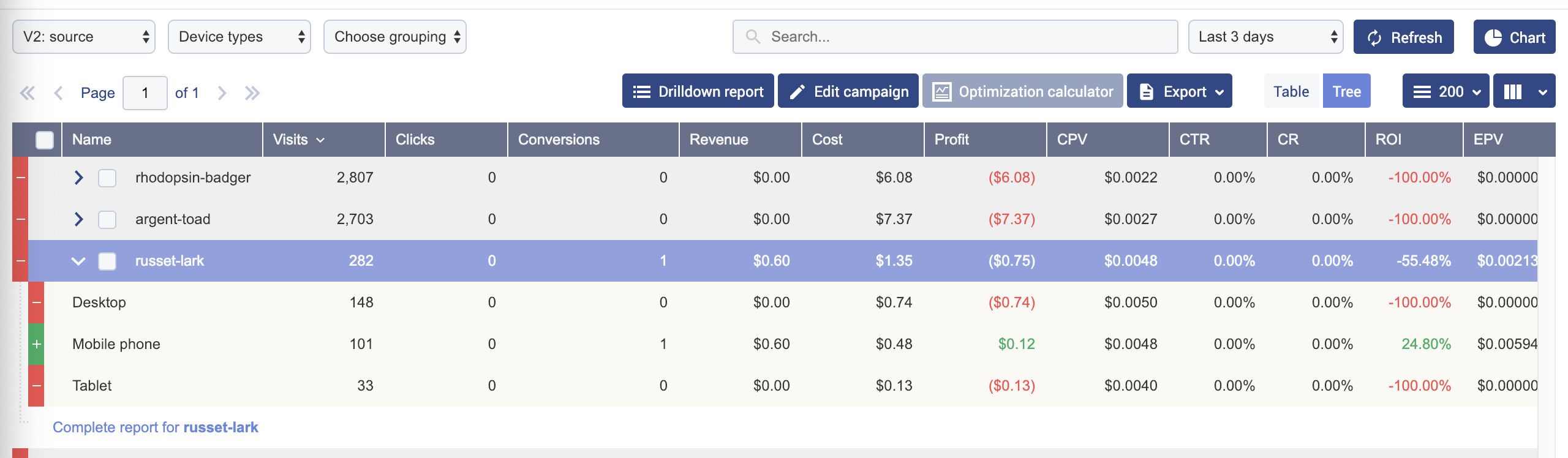 Next, let's take an even deeper look at the source, russet-lark, that has a conversion. I'm breaking it down by device type since I'm currently targeting both mobile and desktop on this campaign: