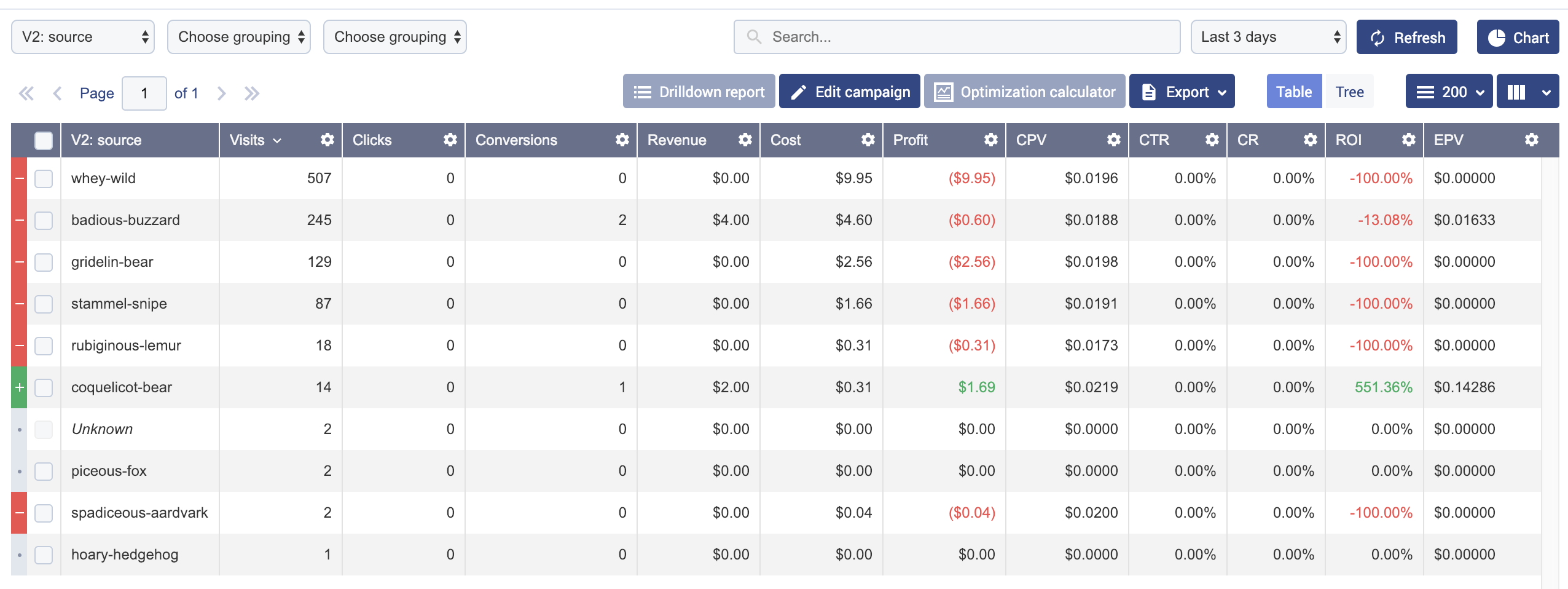 Finally, let's take a look at our most profitable source for these 2 campaigns so far, coquelicot-bear.