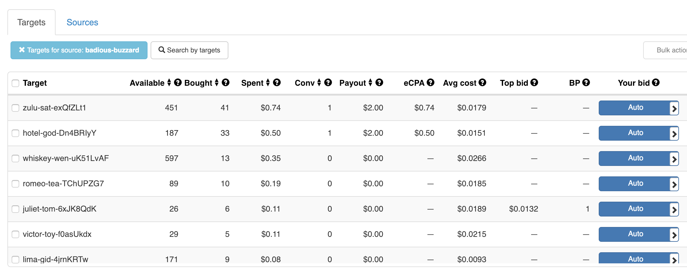 I'm going to take a guess and say I need to bid at least $0.05 to get a better look at this source. My EPV right now is $0.14. I can afford to try $0.05 based on that data. So, for coquelicot-bear, I am setting a manual bid of $0.05. I will continue auto bidding the rest of the sources at $0.02.